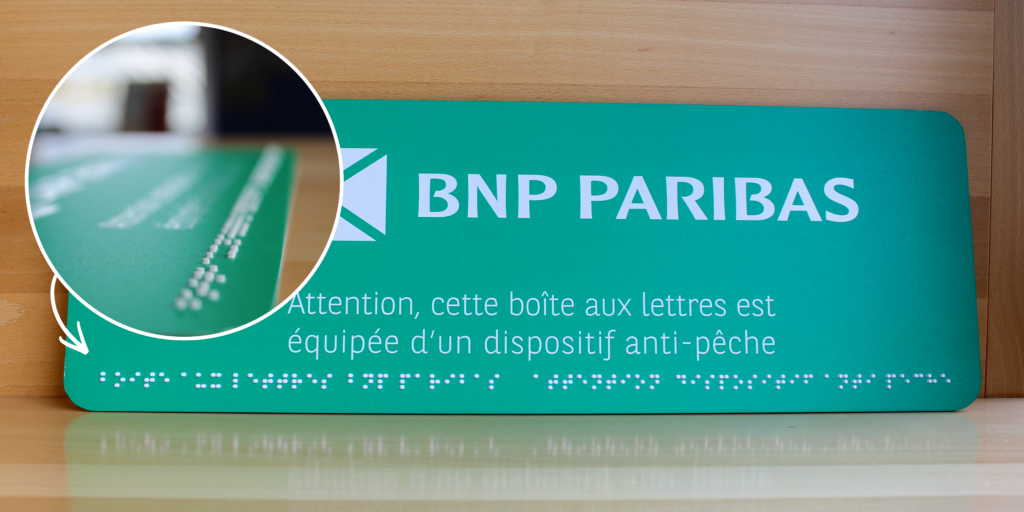 Connaissez-vous les plaques en braille pour boîtes aux lettres ? Récemment, la BNP Paribas nous a accordé sa confiance pour la conception et la fabrication de plaques en braille destinées aux boîtes aux lettres, afin de faciliter l’identification des services et améliorer l’accessibilité pour tous.